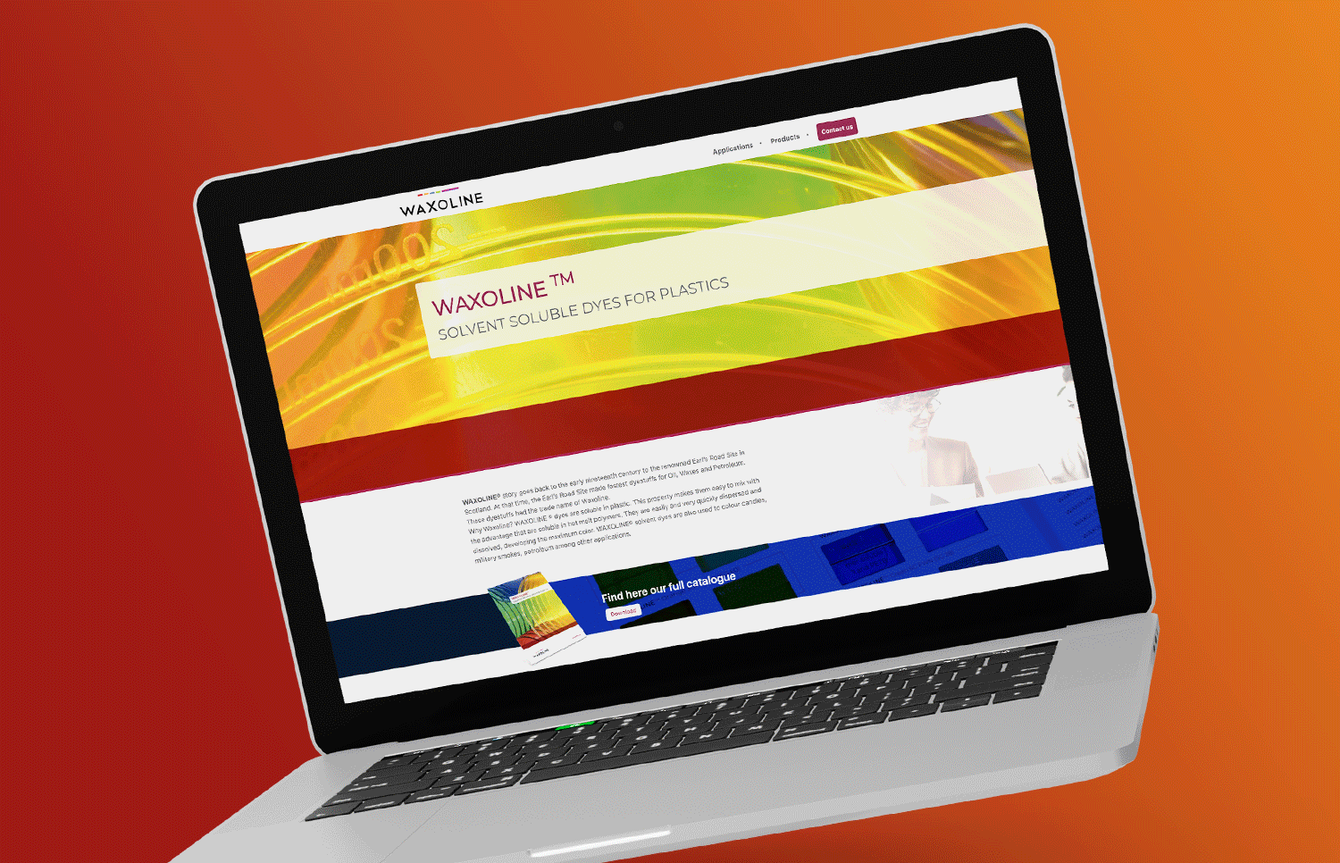 Diseño y programación de página web para Waxoline. Empresa fabricante y distribuidora de colorantes solventes para las industrias del aceite, plásticos, ceras y petróleo. El website cuenta con funcionalidades como el contacto flotante, formulario de descarga de pdf o reserva de productos. Para el apartado de producto se han realizado renders de sus muestras físicas de producto en sus diferentes colores y texturas. Renderizados 3D fotorealistas que simulan las muestras reales, para las que se creó un catálogo expositor.